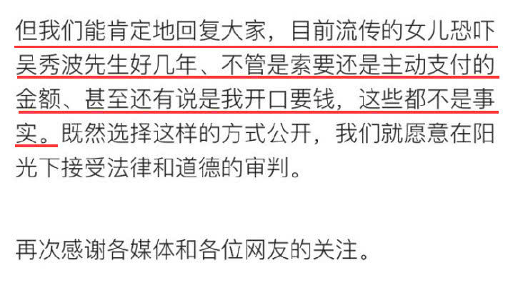 对此陈昱霖的父母表示“何震亚所说并非事实”,否认女儿恐吓吴秀波好几年,不管是索要还是主动支付的金额,甚至还有说是陈昱霖妈妈开口要钱,这些都不是事实。