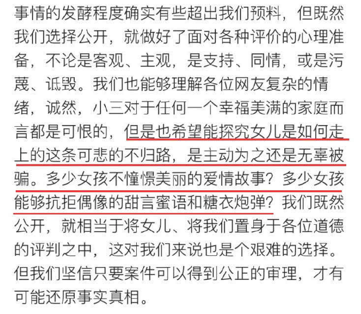 并且对于女儿成为“小三”的事实表示痛心,并接受外界的道德评判,但对于女儿是如何走上这条不归路,是主动为之还是无辜被骗仍持有怀疑的态度。