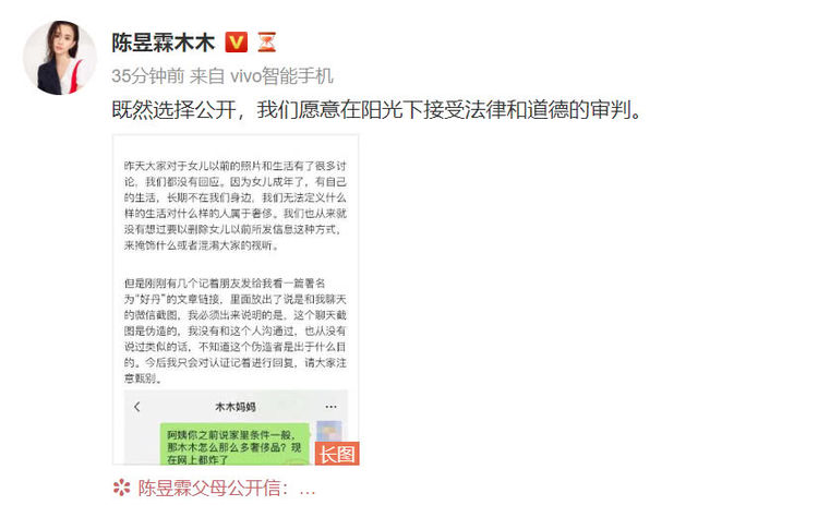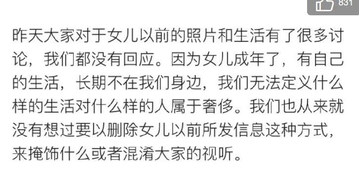 陈昱霖父母首先回应了近日关于女儿奢靡私生活的言论,表示“我们无法定义什么样的生活对什么样的人属于奢侈”,也并没有想过删除女儿以前所发信息这种方式来掩饰什么,并表示此前网上的回应是假的。