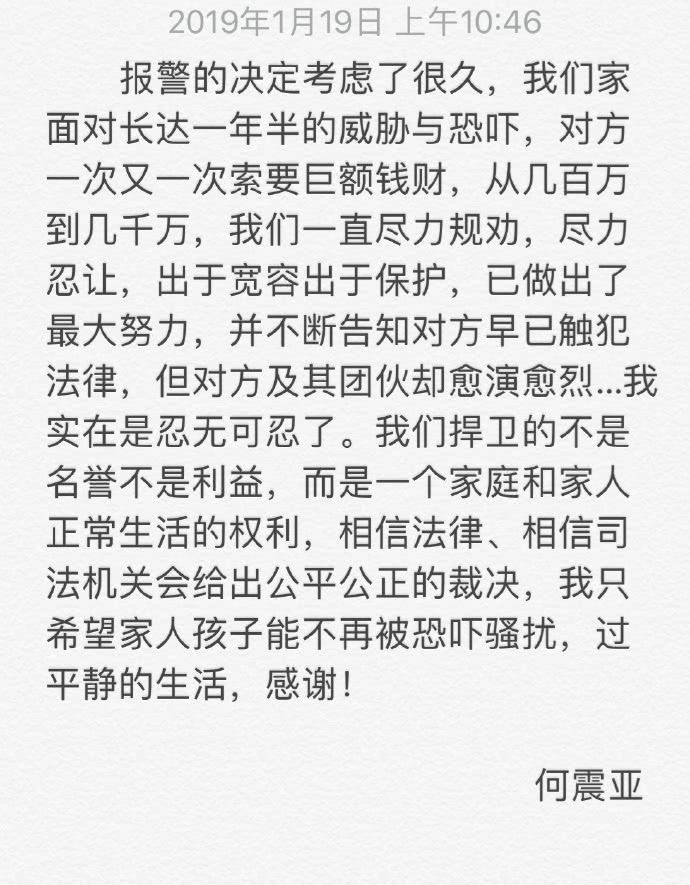 日前吴秀波的妻子何震亚对外发表声明,表示决定报警是因为他们家面对长达一年半的威胁恐吓,屡次索要高大几百万至几千万的金额。