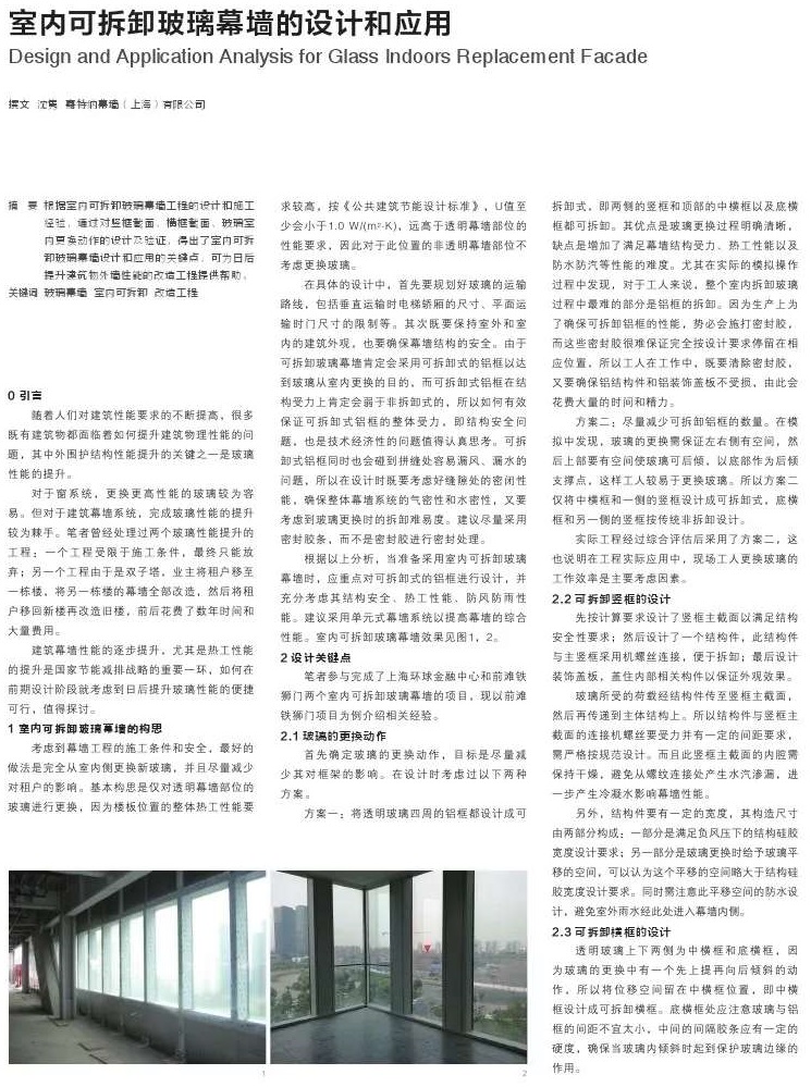 随着人们对建筑性能要求的不断提高,很多既有建筑物都面临着如何提升建筑物理性能的问题,其中外围护结构性能提升的关键之一是玻璃性能的提升。根据室内可拆卸玻璃幕墙工程的设计和施工经验,通过对竖框截面、横框截面、玻璃室内更换动作的设计及验证,得出了室内可拆卸玻璃幕墙设计和应用的关键点,可为日后提升建筑物外墙性能的改造工程提供帮助。