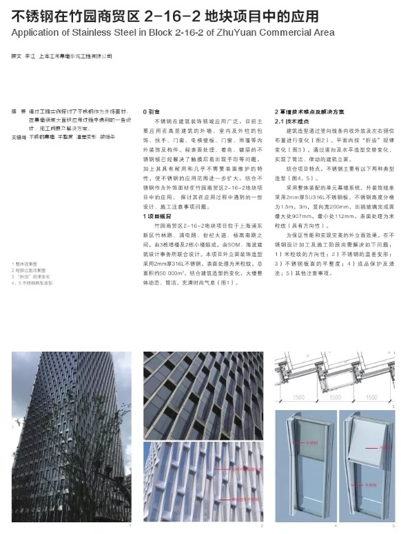 不锈钢在建筑装饰领域应用广泛,目前主要应用在高层建筑的外墙、室内及外柱的包饰、扶手、门套、电梯壁板、门窗、雨篷等内外装饰及构件。经表面处理、着色、镀层的不锈钢板已经解决了触摸后易出现手印等问题,加上其具有耐用和几乎不需要表面维护的特性,使不锈钢的应用范围进一步扩大。结合不锈钢作为外饰面材在竹园商贸区2-16-2地块项目中的应用, 探讨其在应用过程中遇到的一些设计、施工注意事项问题。