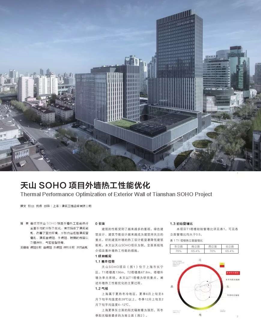 通过对天山 SOHO 项目外墙热工性能进行全面系统的分析及优化,有效降低了建筑能耗,改善了室内环境。分析内容包括建筑窗墙比、建筑自遮阳、外遮阳、玻璃的选择以及框传热、气密性指标等。