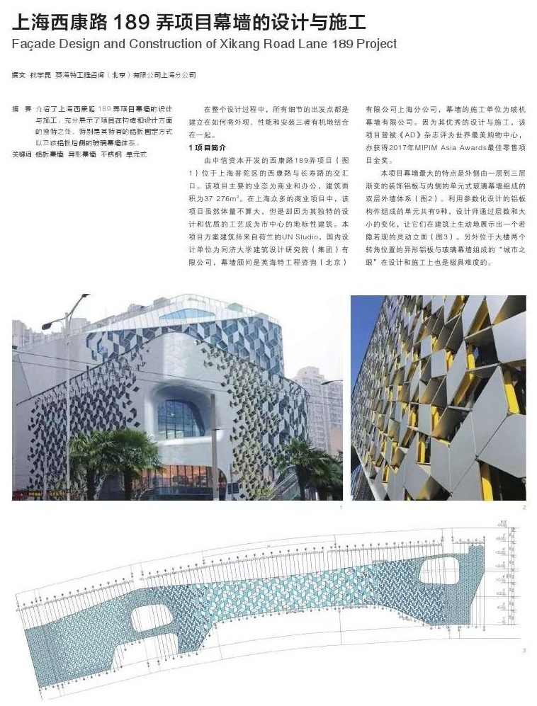 介绍了上海西康路189弄项目幕墙的设计与施工,充分展示了项目在构造和设计方面的独特之处,特别是其特有的铝板固定方式以及该铝板后侧的玻璃幕墙体系。在整个设计过程中,所有细节的出发点都是建立在如何将外观、性能和安装三者有机地结合在一起。