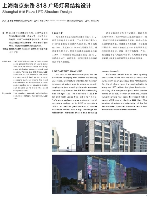 本文采用中英文对照模式,以上海 818 灯幕结构为例,介绍了自由找形结构建造的过程,包含加工、安装及造价控制等。论证了一些最基本的概念,比如如何定义自由找形的偏差值,设计清晰标准的节点,来确保实现最复杂的几何形状。