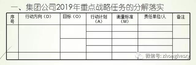 2)目标(O):是行动方向在2019年期望成功状态的表述,下一级目标(O)是上一级对应行动计划(A)的衡量标准(M)。