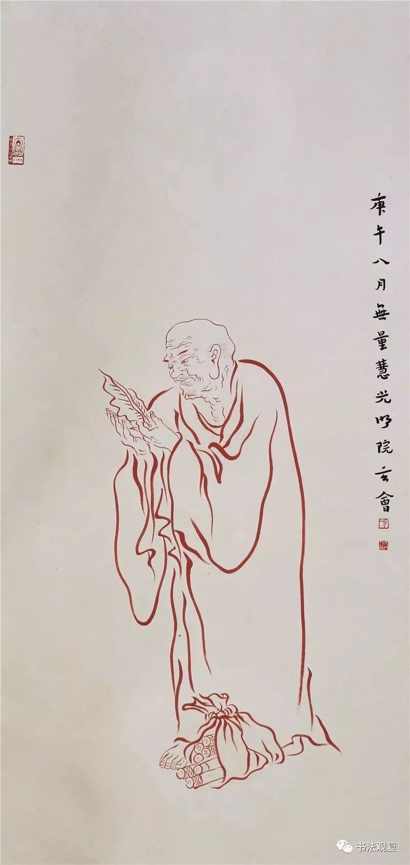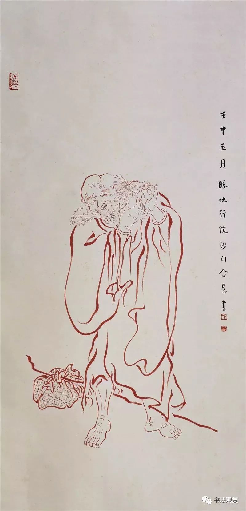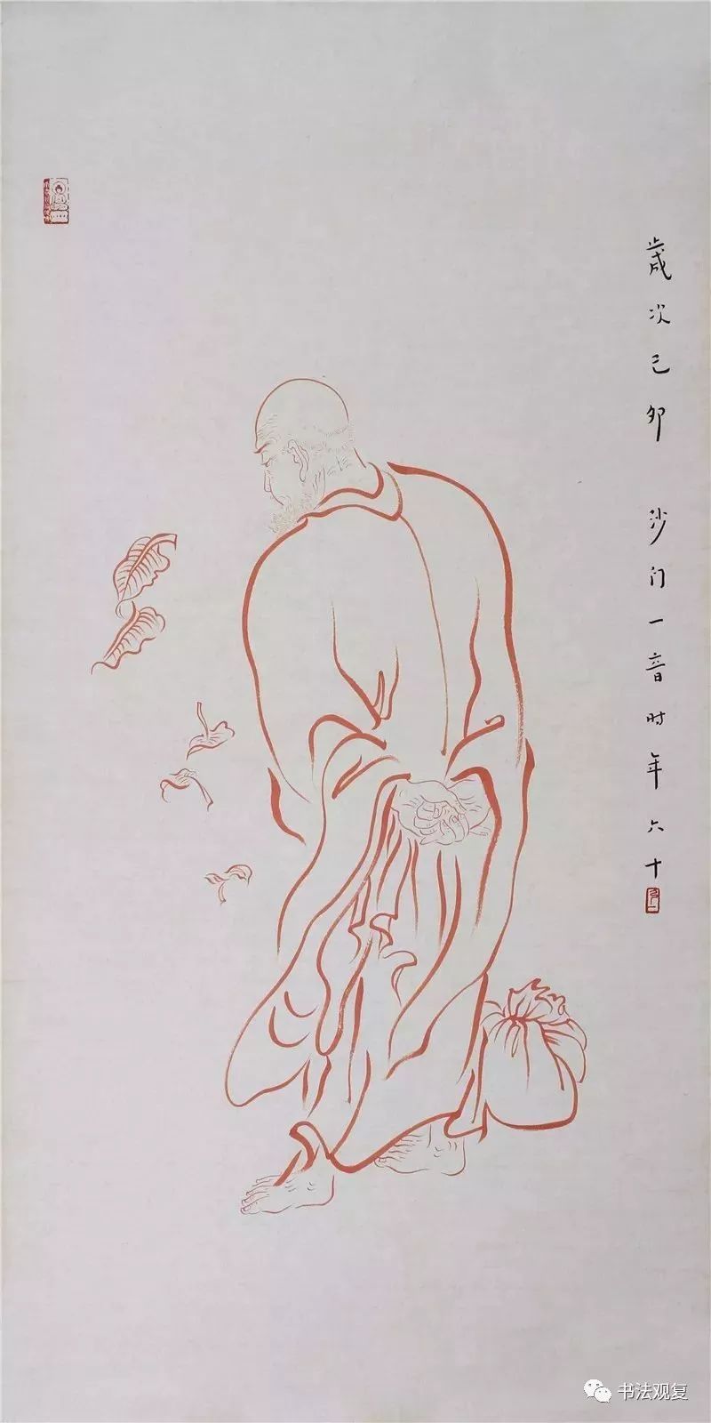 弘一法师在绘画上多见的,就是其绘制的罗汉图。这些罗汉图在笔墨上看起来较为松动自然,可除了书法中的那份空灵安静的感觉之外,更多的显示出其生动多姿的一面。不管是穿针引线,还是闲散无事,每一个阿罗汉都有自己不同的神态,从中可以看出弘一法师慈悲平等的菩萨觉地。