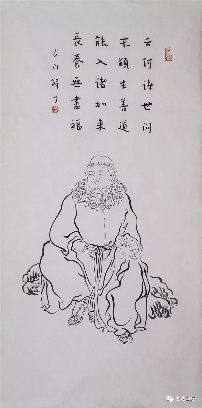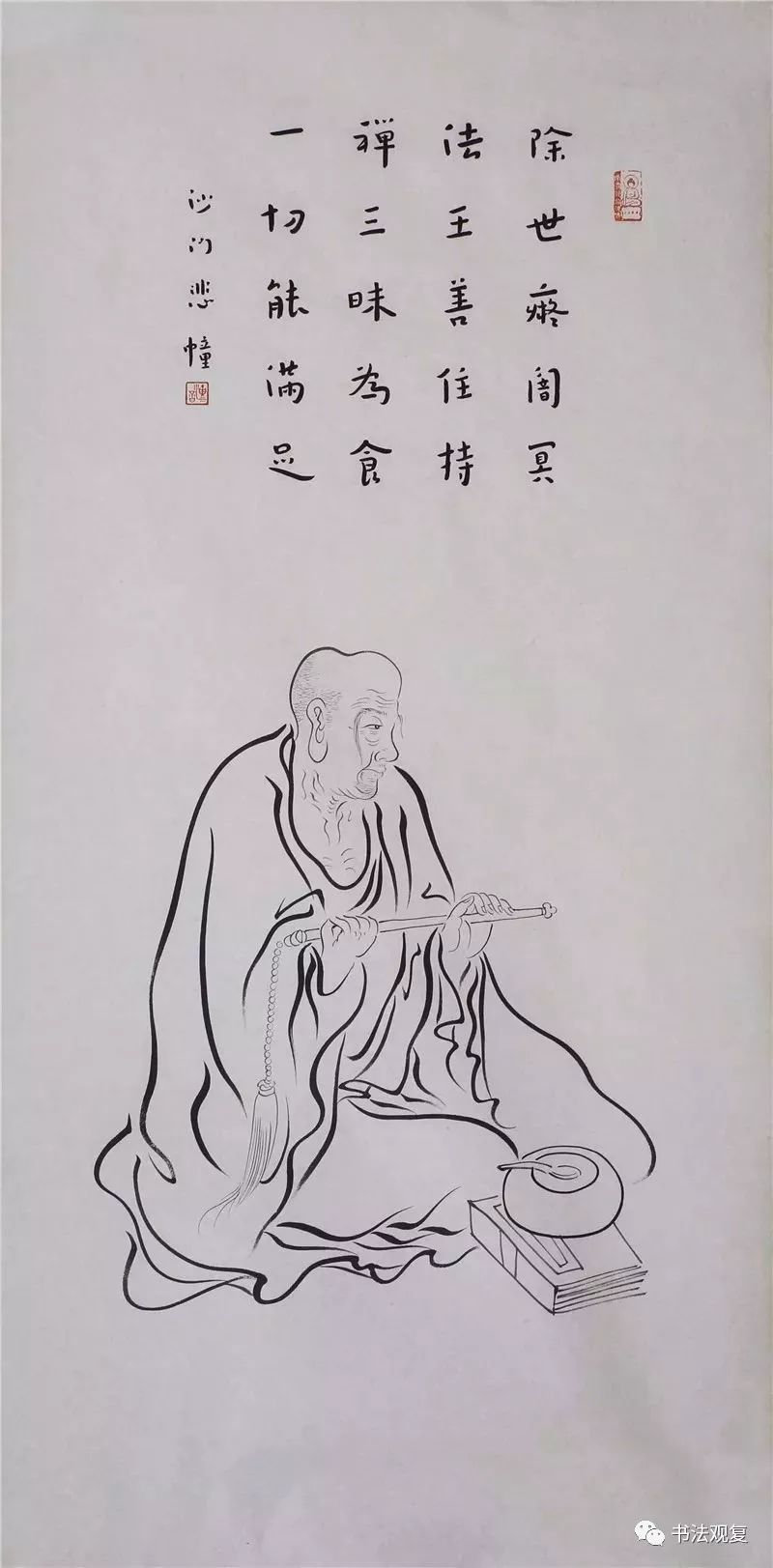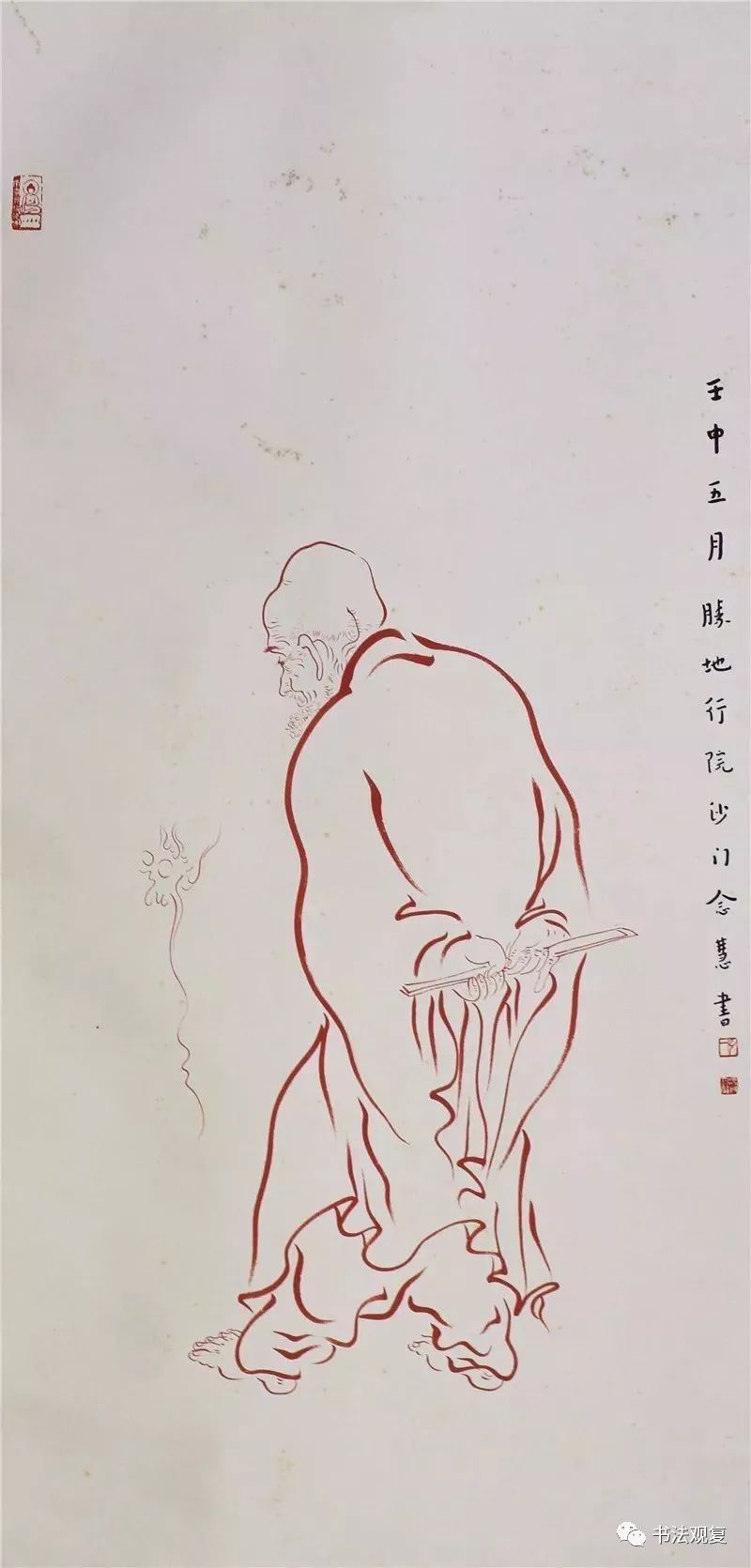 弘一法师在绘画上多见的,就是其绘制的罗汉图。这些罗汉图在笔墨上看起来较为松动自然,可除了书法中的那份空灵安静的感觉之外,更多的显示出其生动多姿的一面。不管是穿针引线,还是闲散无事,每一个阿罗汉都有自己不同的神态,从中可以看出弘一法师慈悲平等的菩萨觉地。