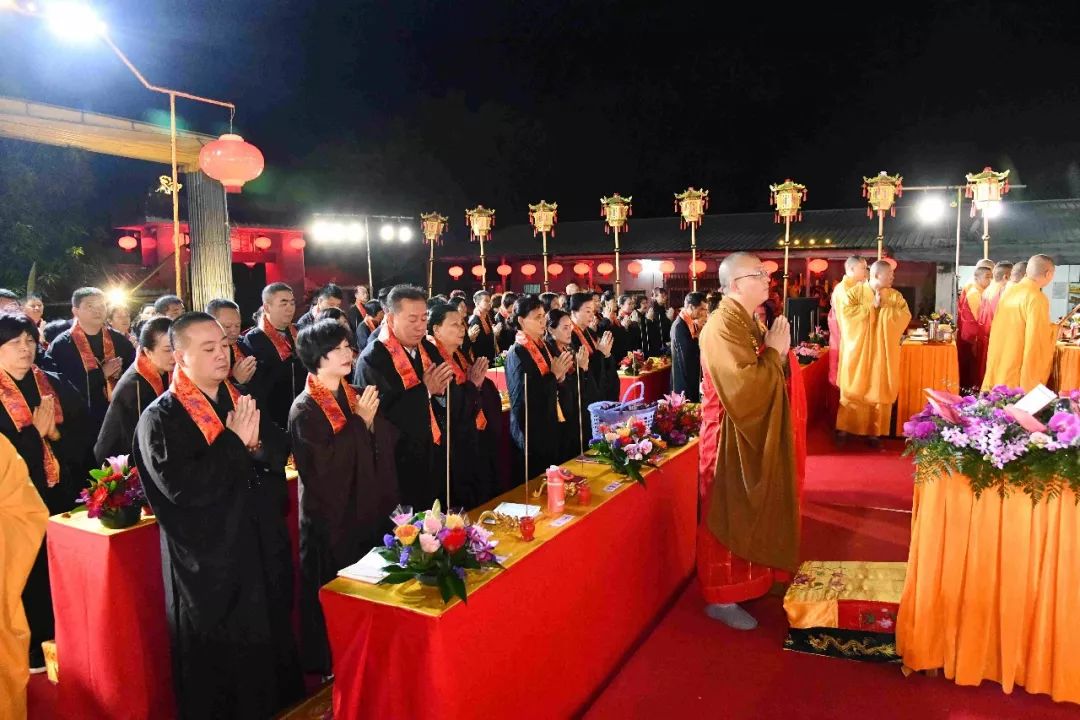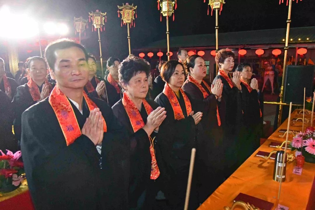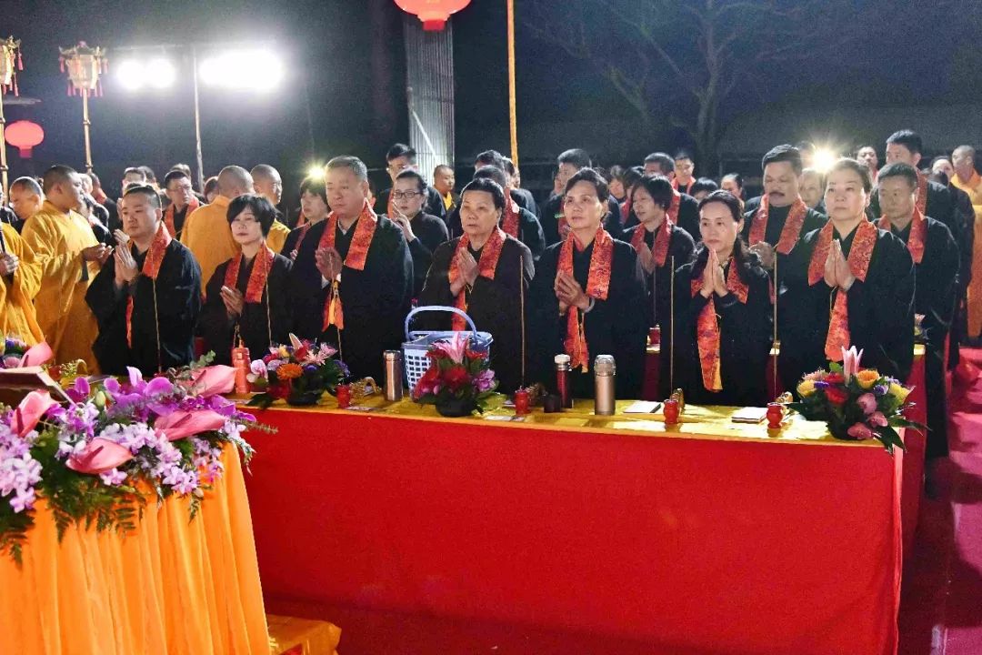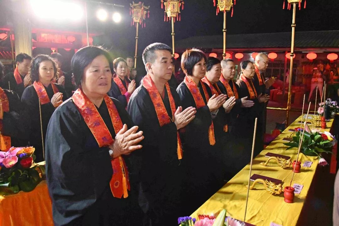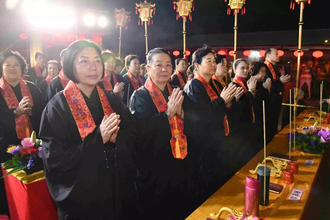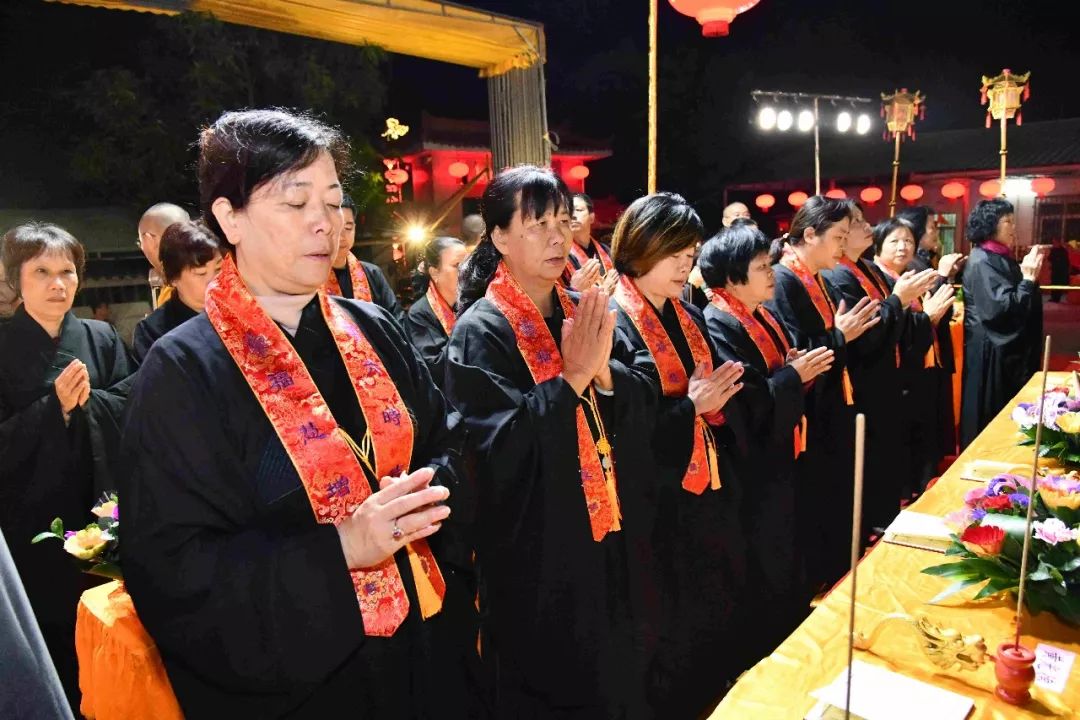 凌晨2时,告赦仪式开始。三位法师领众功德主依次拈香问 讯,至诚礼拜十方法界,恭请捷疾持赦使者携“赦书”、“赦牒”,上启天庭,下通幽冥,陈情法会缘由,望其下释拘紧,让六道中受苦困缚的众生能获赦通行,赴水陆胜会听经闻法,趣入菩提。藉此功德超荐群灵,解离三途之苦。