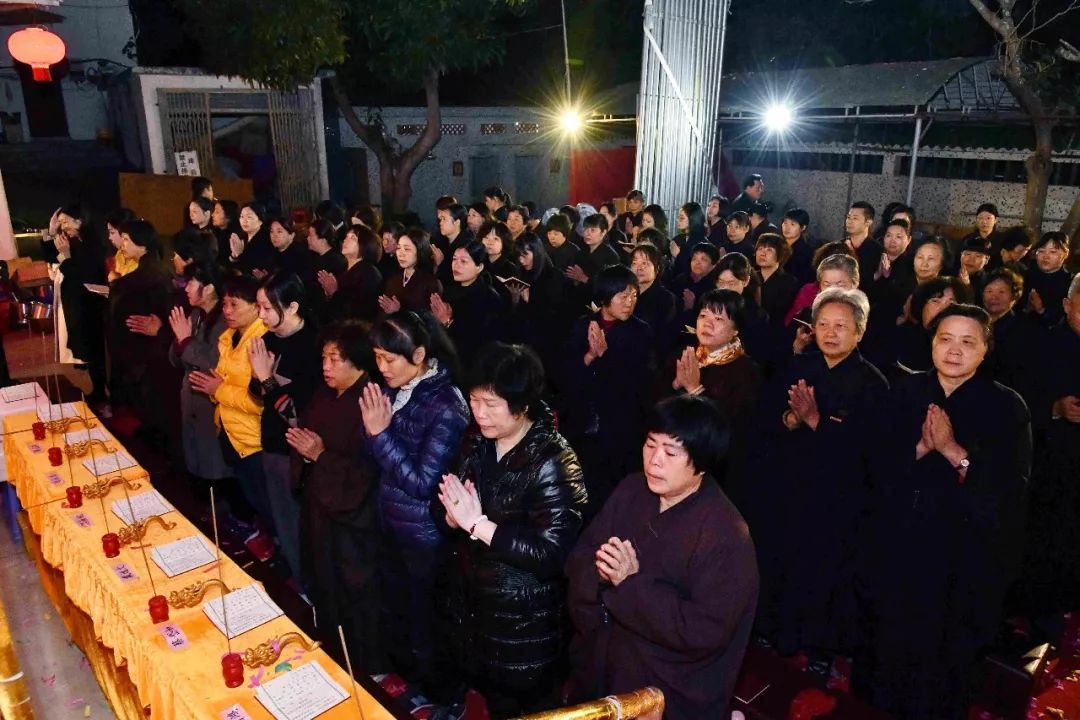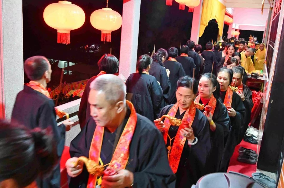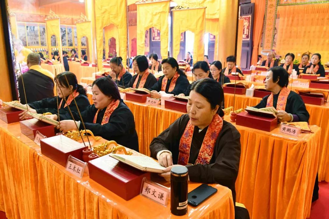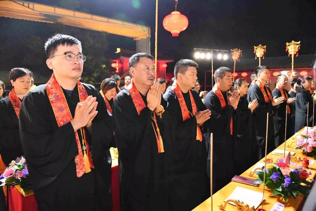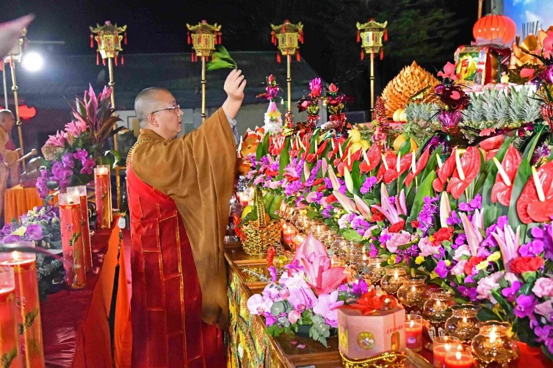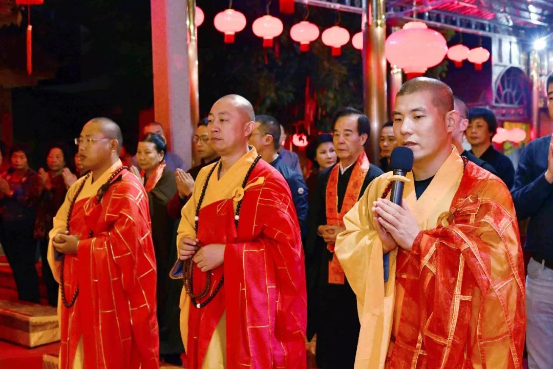 凌晨2时,告赦仪式开始。三位法师领众功德主依次拈香问 讯,至诚礼拜十方法界,恭请捷疾持赦使者携“赦书”、“赦牒”,上启天庭,下通幽冥,陈情法会缘由,望其下释拘紧,让六道中受苦困缚的众生能获赦通行,赴水陆胜会听经闻法,趣入菩提。藉此功德超荐群灵,解离三途之苦。