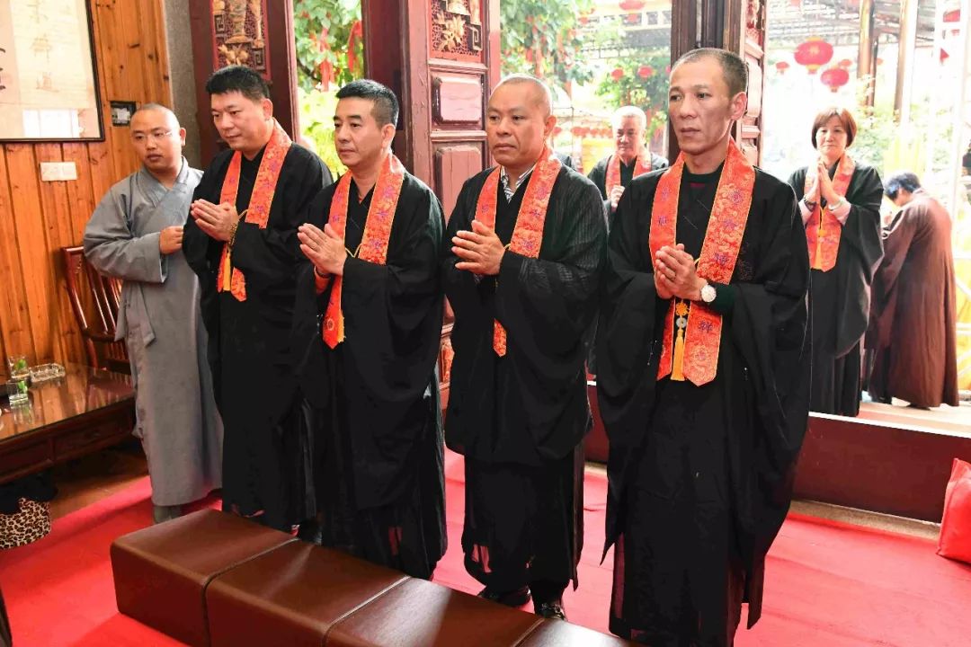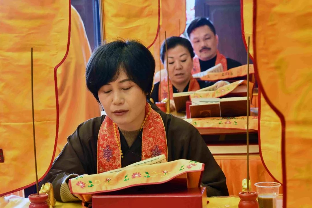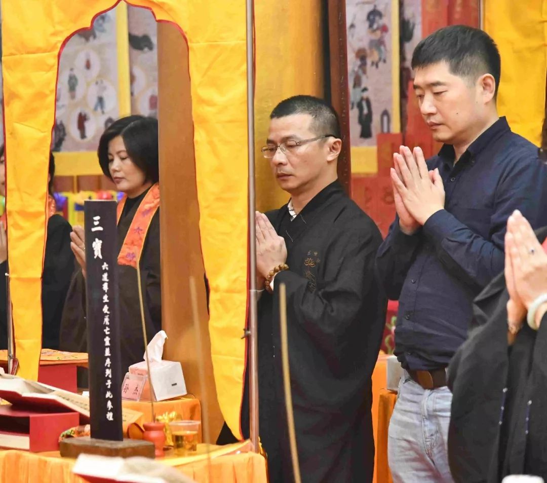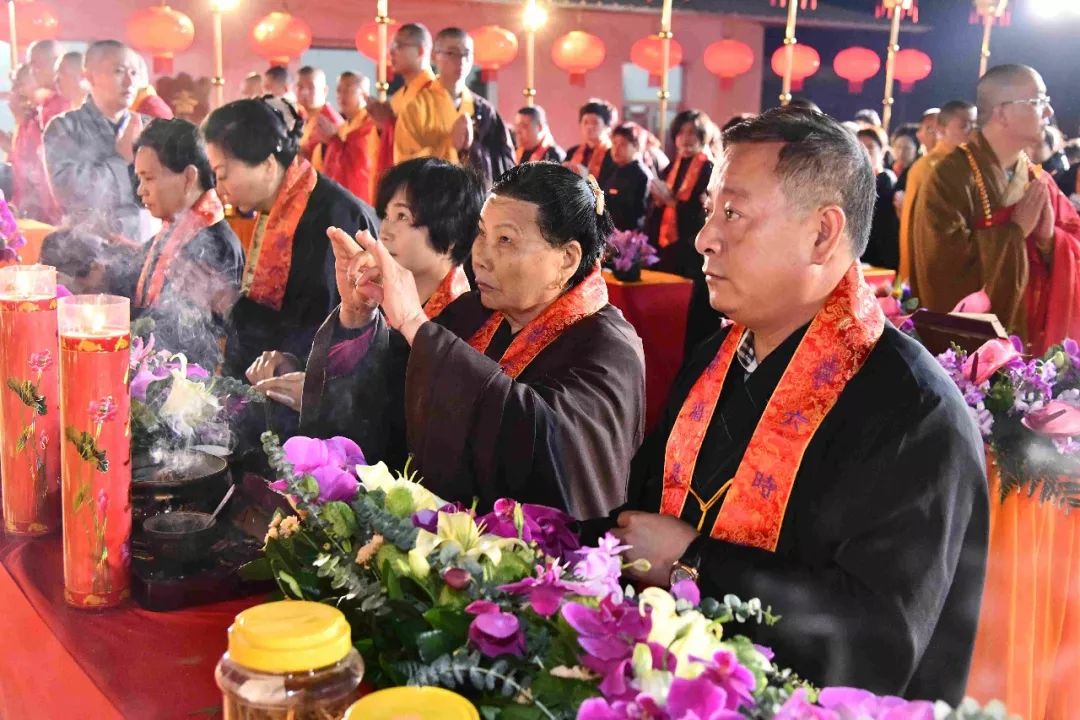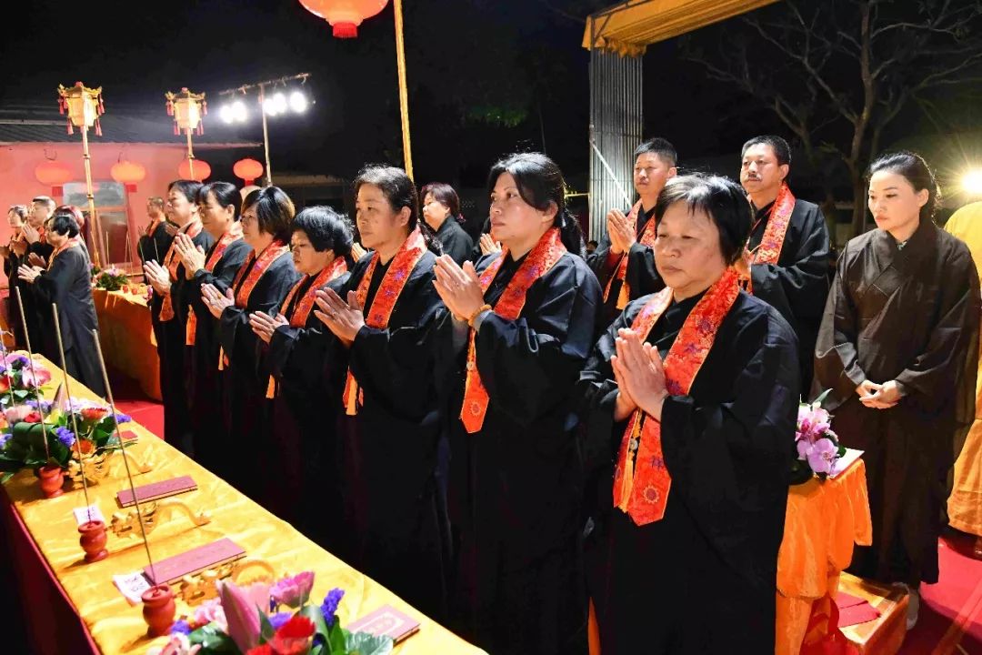 傍晚,内坛启建授幽冥戒法事,法会现场庄严肃穆,斋主虔诚作意,祈愿佛力加被众等离苦得乐,善根增长。授幽冥戒,系在世之人,为已故眷属及六道群灵虔诚代求受三皈及大乘菩萨戒,令众生受持戒规,得以远离身、口、意恶业,而获得清净,增长善心与善念。三恶道众生因为生前造作恶业堕落恶道中受苦,授幽冥戒即是以菩萨度生慈悲情怀,令冥界众生皈依三宝,祈求忏悔,发菩提心,受大乘戒,从而超脱轮回之苦。