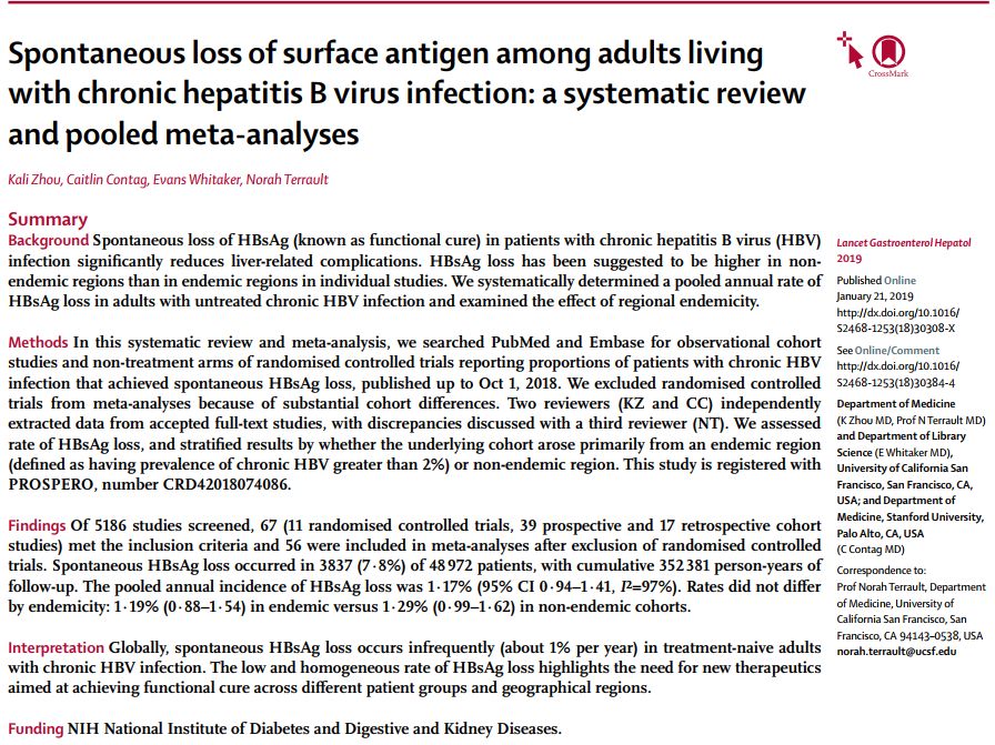 加州大学医学院研究人员进行了一项系统综述和 Meta 分析研究,在该研究中研究人员系统性的分析了未经治疗的成年慢性HBV感染者的 HBsAg 年均自发性清除率,并对慢性HBV流行和非流行地区的 HBsAg 自发性清除率进行了比较。