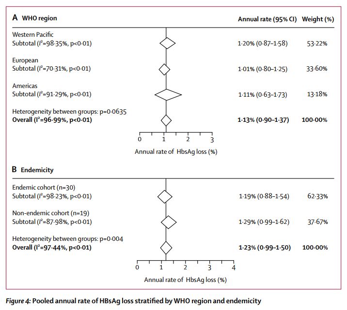 慢性HBV感染者的HBsAg自发性清除能显著降低肝脏相关合并症。以往有研究认为非流行地区的慢性HBV感染者 HBsAg 自发性清除要比流行区域的要高。发表在最新一期的柳叶刀子刊《The Lancet Gastroenterol Hepatol》上的系统综述和集合 Meta 分析结果似乎并不认同这一研究结论。