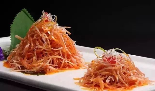 水磨丝这道菜距今已有200 余年历史,它以猪耳为原料,因将猪耳传统名菜平面片开,可见水磨石般花而因此得名,是考验厨师刀工的一道菜。