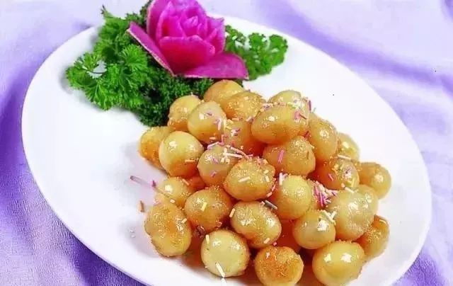 蜜汁轱辘因形状为球体,俗称轱辘。蜜汁轱鹿色泽金黄,外脆里嫩,香甜油润,在撒上白糖,吃一口,从嘴里甜到心里。