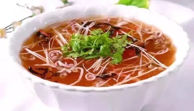 酸辣肚丝呈粉红色,鲜酸微辣。将猪肚煮熟,再将熟猪肚切成5厘米长,3毫米粗细的丝,冬笋切相应的丝。香菜切末……(此处省略100字)用湿淀粉勾芡,淋入香油,撒上香菜末,出锅装盘上桌即成。喝一口酸肚丝汤,真的是酸酸辣辣,挑逗你的味觉神经,喝一口便欲罢不能,忍不住再来一碗!