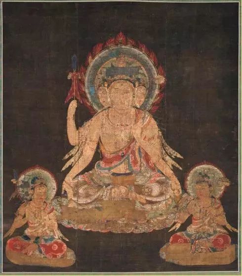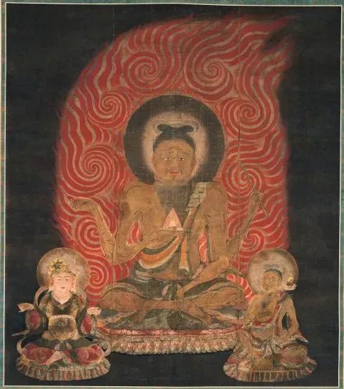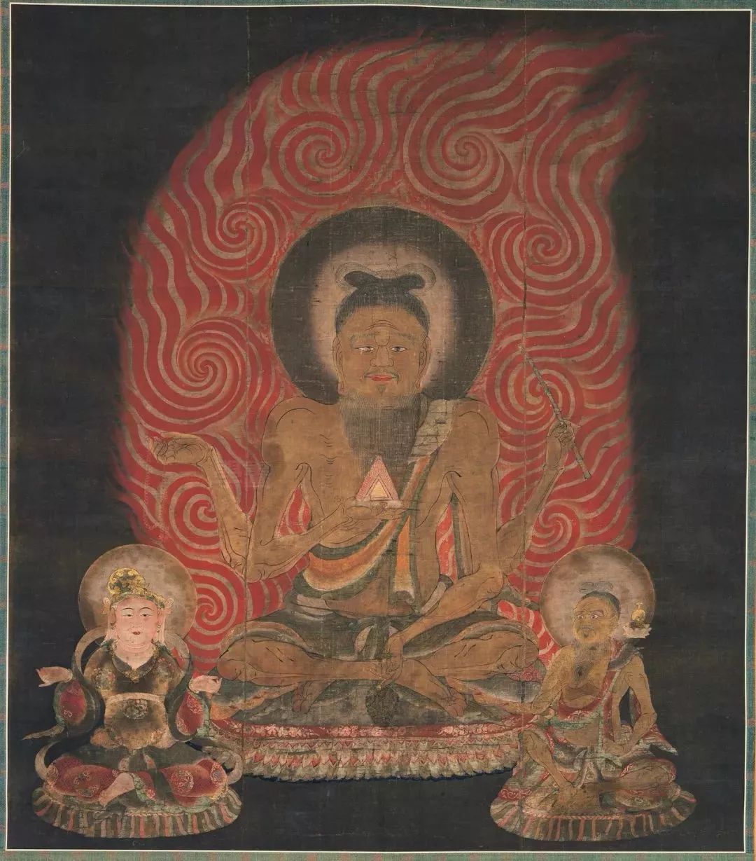 本幅火天像,是宫中真言院为了每年正月所举办的“御七日修法”活动,于大治2年(1127)所绘制的十二天像之一,原为教王护国寺所藏。十二天,是八方、天地以及日月的守护神,火天是守护东南方之神。火天经常以表情严肃的老人形象呈现,本幅的火天却显得温和而亲切。