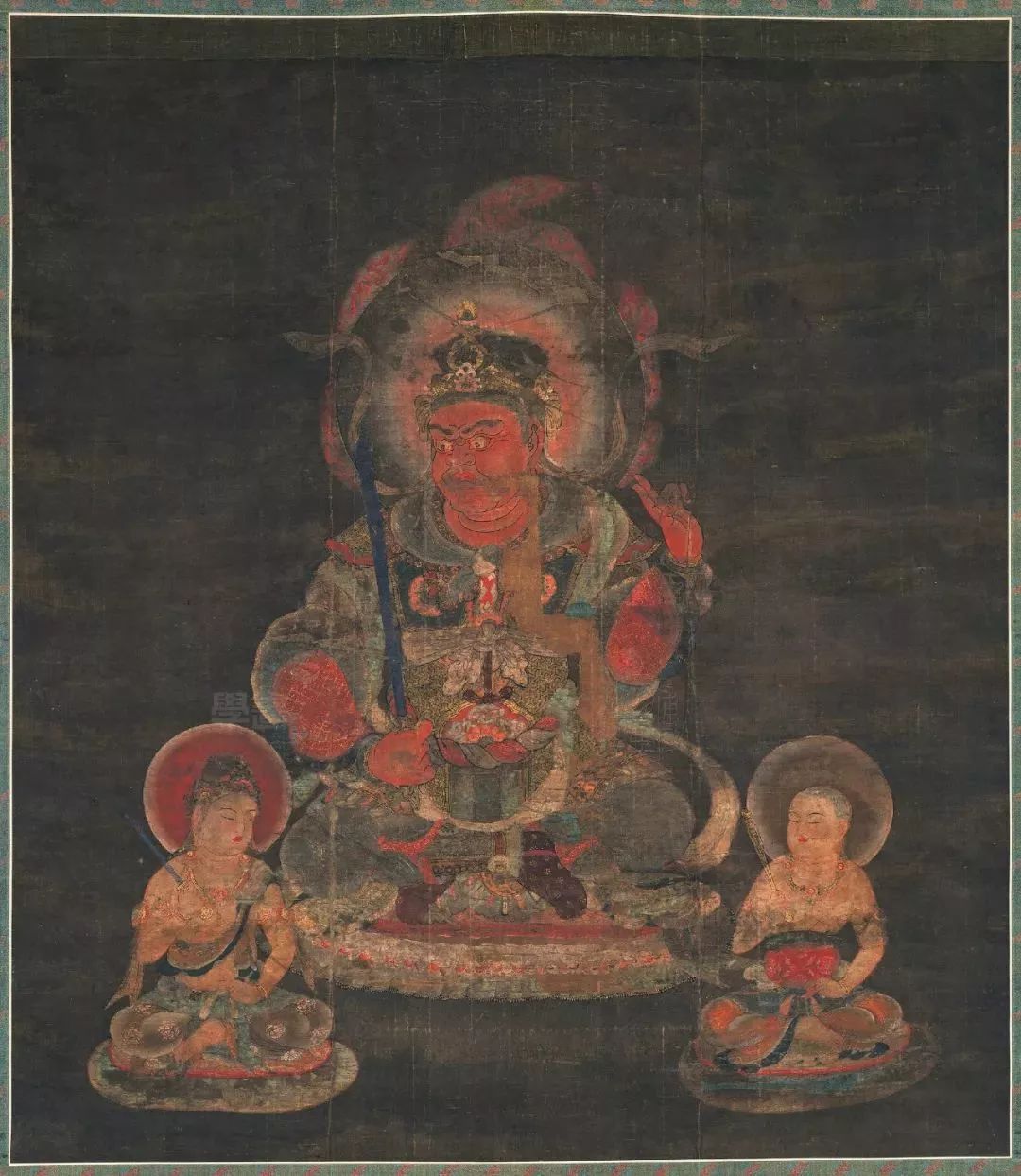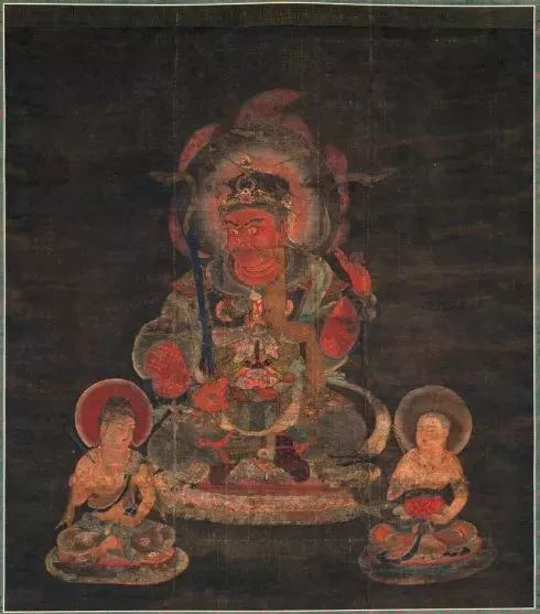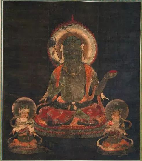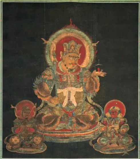毘沙门天又称为多闻天,是守护北方之神,为药叉吞食鬼神之主。右手持宝棒,左手持宝塔,在毛毡座上呈结跏趺坐。这是教王护国寺旧藏的十二天像之一,由于从相关文献可知其制作年代,是非常重要的作品。用色丰润而截金纹样华丽,显示出院政期的喜好,是一幅优美的毘沙门天像。