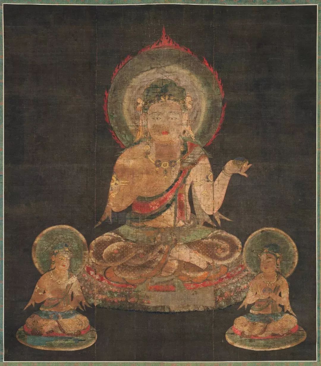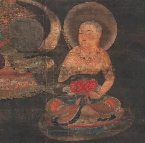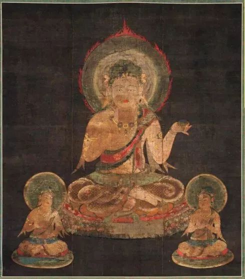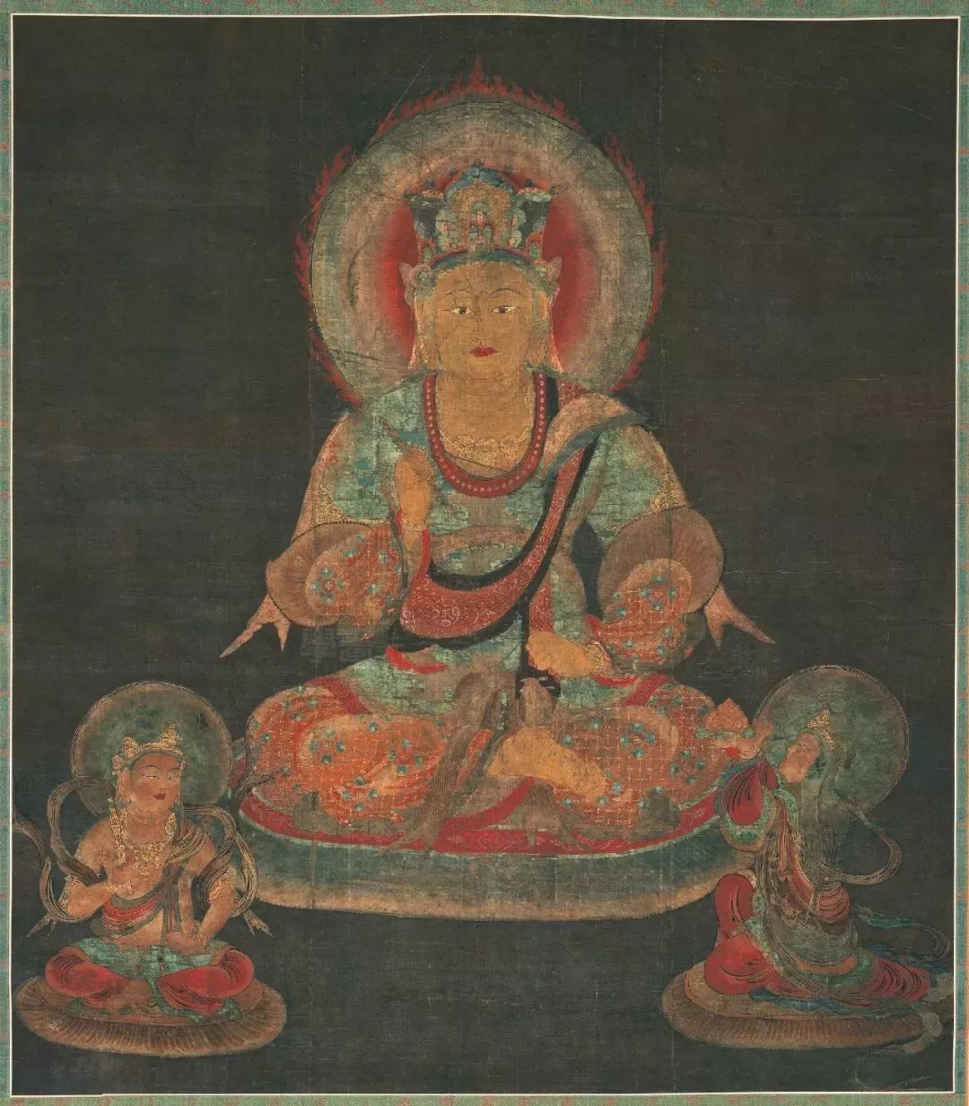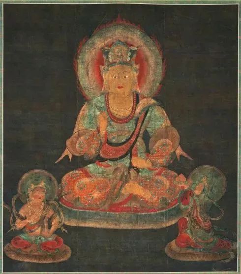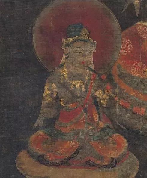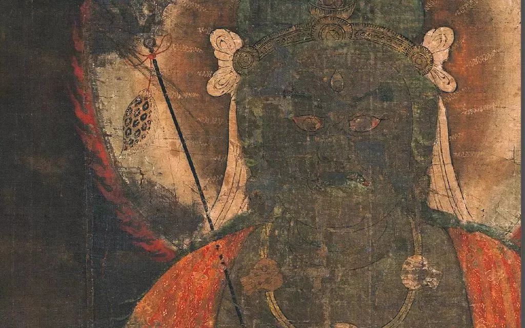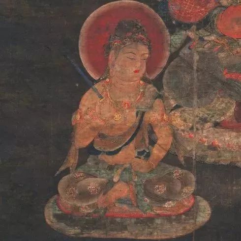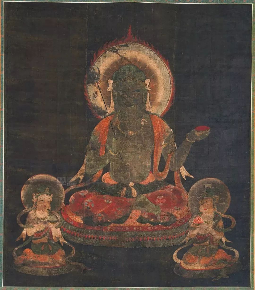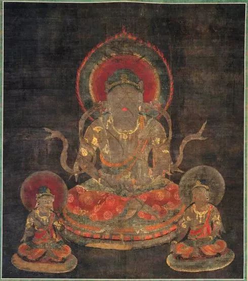 本幅阎魔天像,是宫中真言院为了每年正月所举办的“御七日修法”活动,于大治2年(1127)所绘制的十二天像之一,原为教王护国寺所藏。十二天,是八方、天地以及日月的守护神,阎魔天是守护南方之神,右手手掌向上,左手持人头幢。阎魔天以慈悲相表现,身上披挂的华丽装饰品,都用金银箔加以妆点。