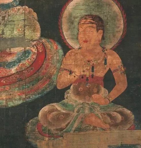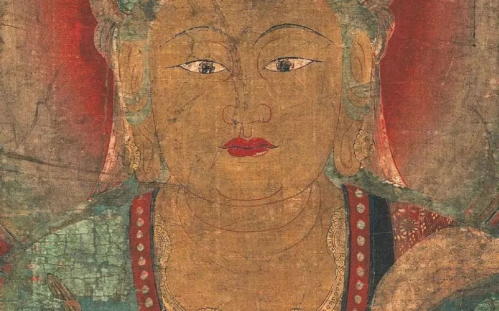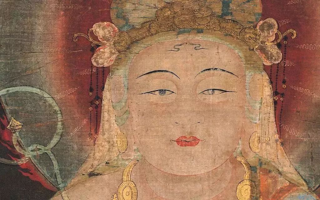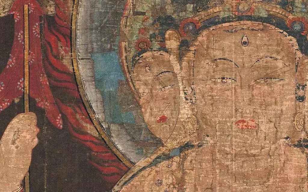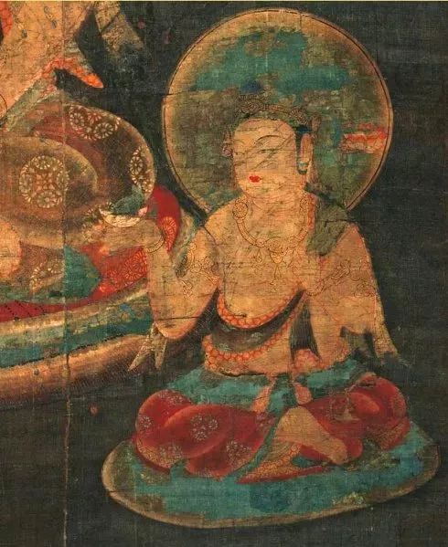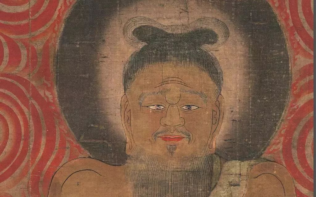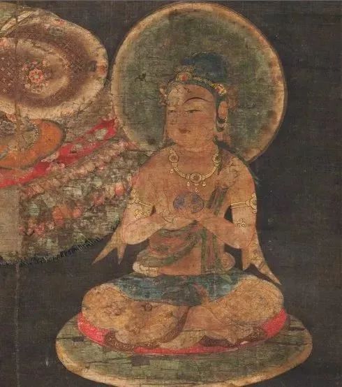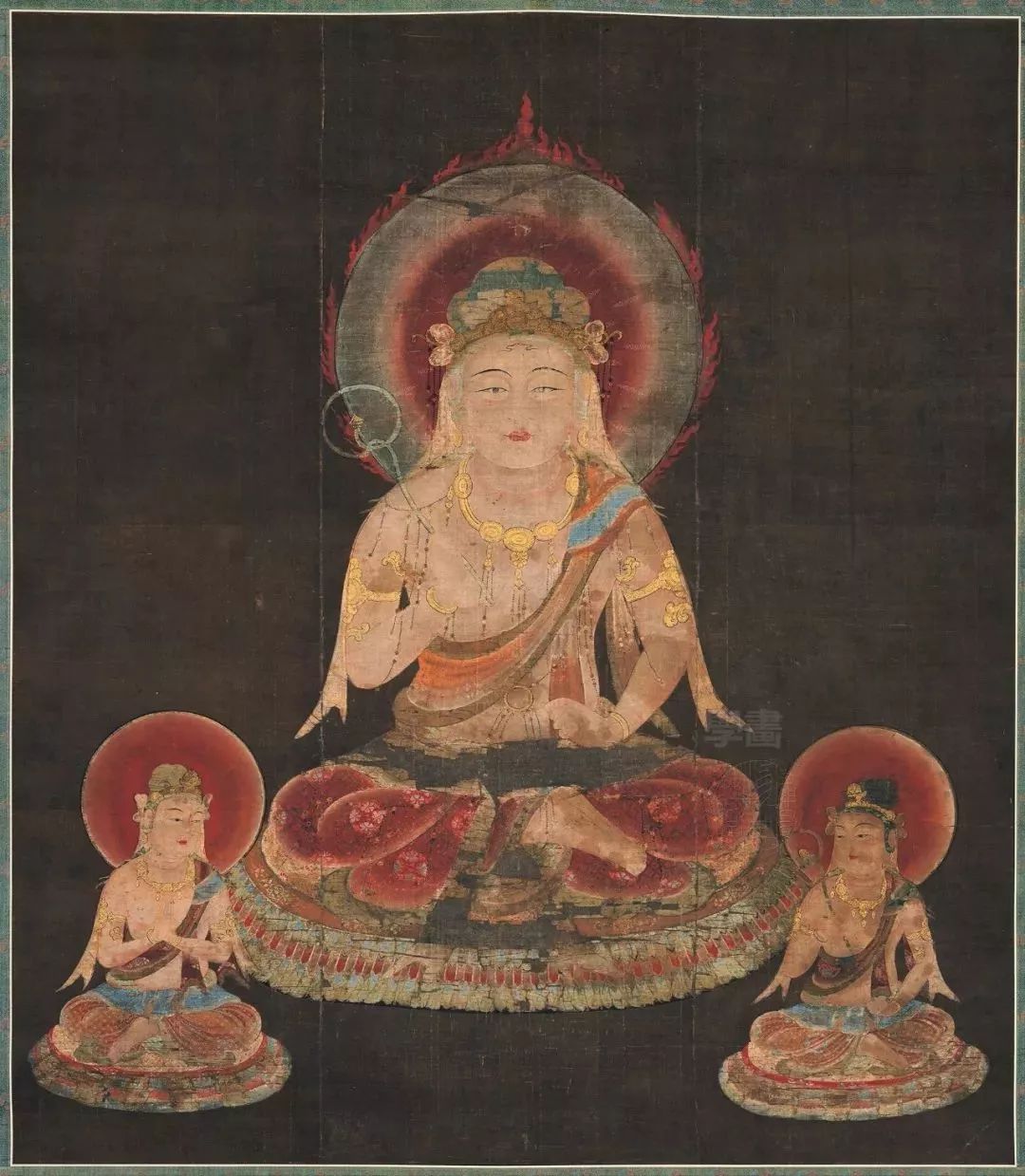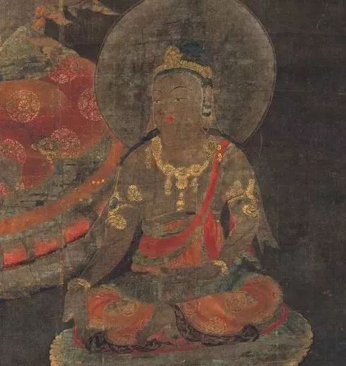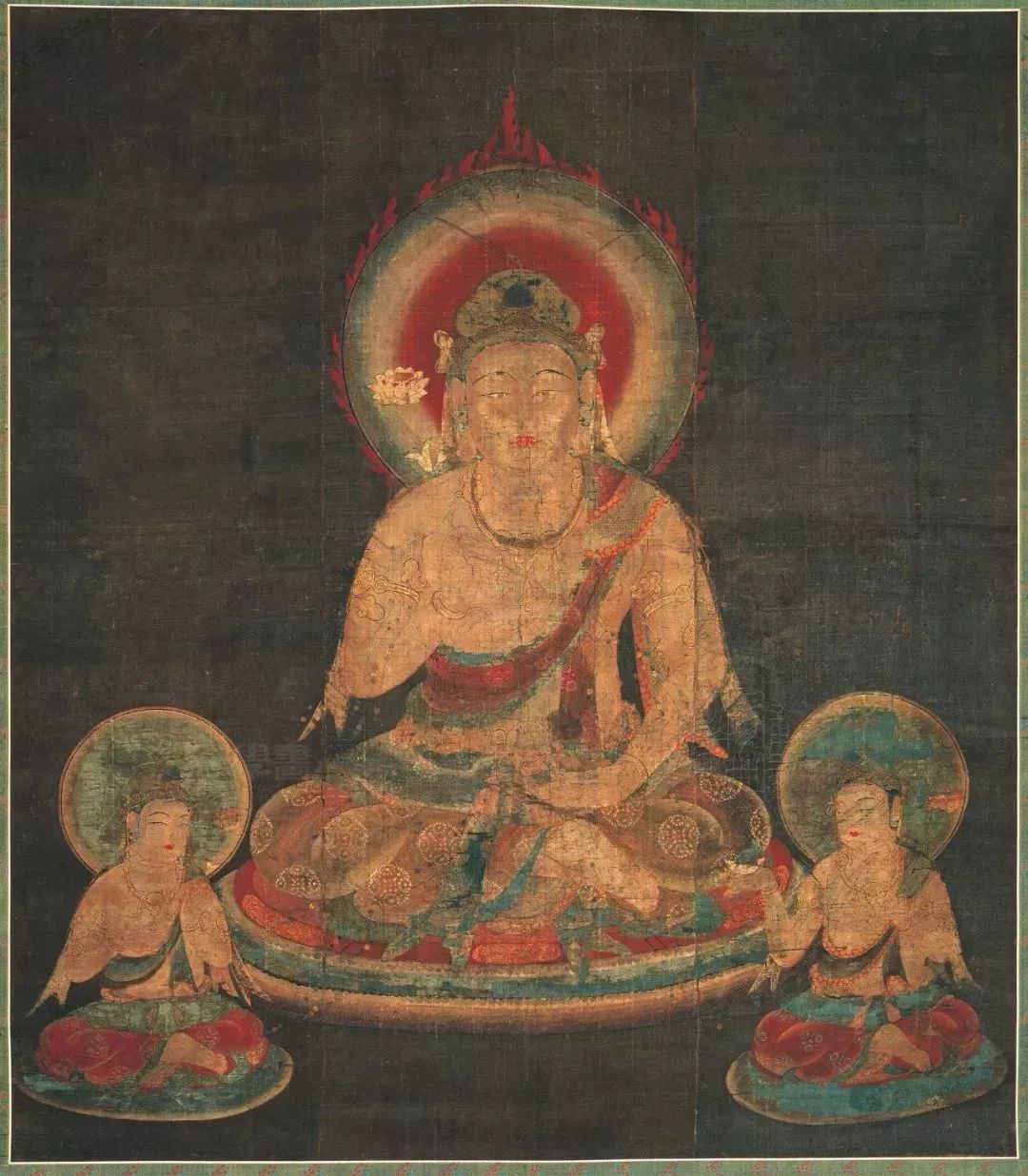本幅阎魔天像,是宫中真言院为了每年正月所举办的“御七日修法”活动,于大治2年(1127)所绘制的十二天像之一,原为教王护国寺所藏。十二天,是八方、天地以及日月的守护神,阎魔天是守护南方之神,右手手掌向上,左手持人头幢。阎魔天以慈悲相表现,身上披挂的华丽装饰品,都用金银箔加以妆点。