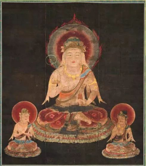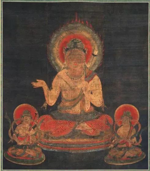 这幅日天像,是宫中真言院为了每年正月所举办的“御七日修法”活动,于大治2年(1127)所绘制的十二天像之一,坐于毛毡座上的姿态是其特色,也有乘坐三头到七头白马马车的例子。