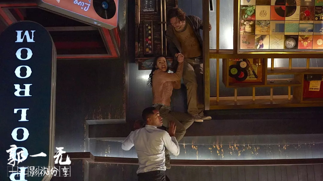 电话里传出的诡异音乐,真是太刺耳、太要命了!除了耳膜疼痛的折磨,体力消耗也是巨大的,因为每过一段时间,地板就会掉下去一块,所以不能站在地板上,他们得找有固定摆设可以扒住的墙壁落脚。