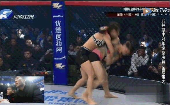 2017赛季年终总决赛女子蝇量级金腰带争夺战,苗婕VS梁娜,一位是中国女子柔术第一人、“超人妈妈”苗婕,一位是武林笼中对7连胜、首位签约Bellator的中国运动员梁娜,两位国内顶级女子格斗选手在本场狭路相逢!二人都有扎实的摔跤功底,地面大战相当刺激,然而苗婕在和对手互摔中手臂不慎受伤,无法继续比赛,梁娜TKO苗婕拿下胜利,并捧起国内造价最高、世界搏击史上的首条景泰蓝金腰带!