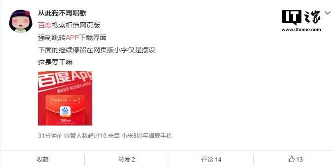 在微博上也有不少网友反映,手机浏览器使用百度搜索内容出现百度App宣传页面跳转。