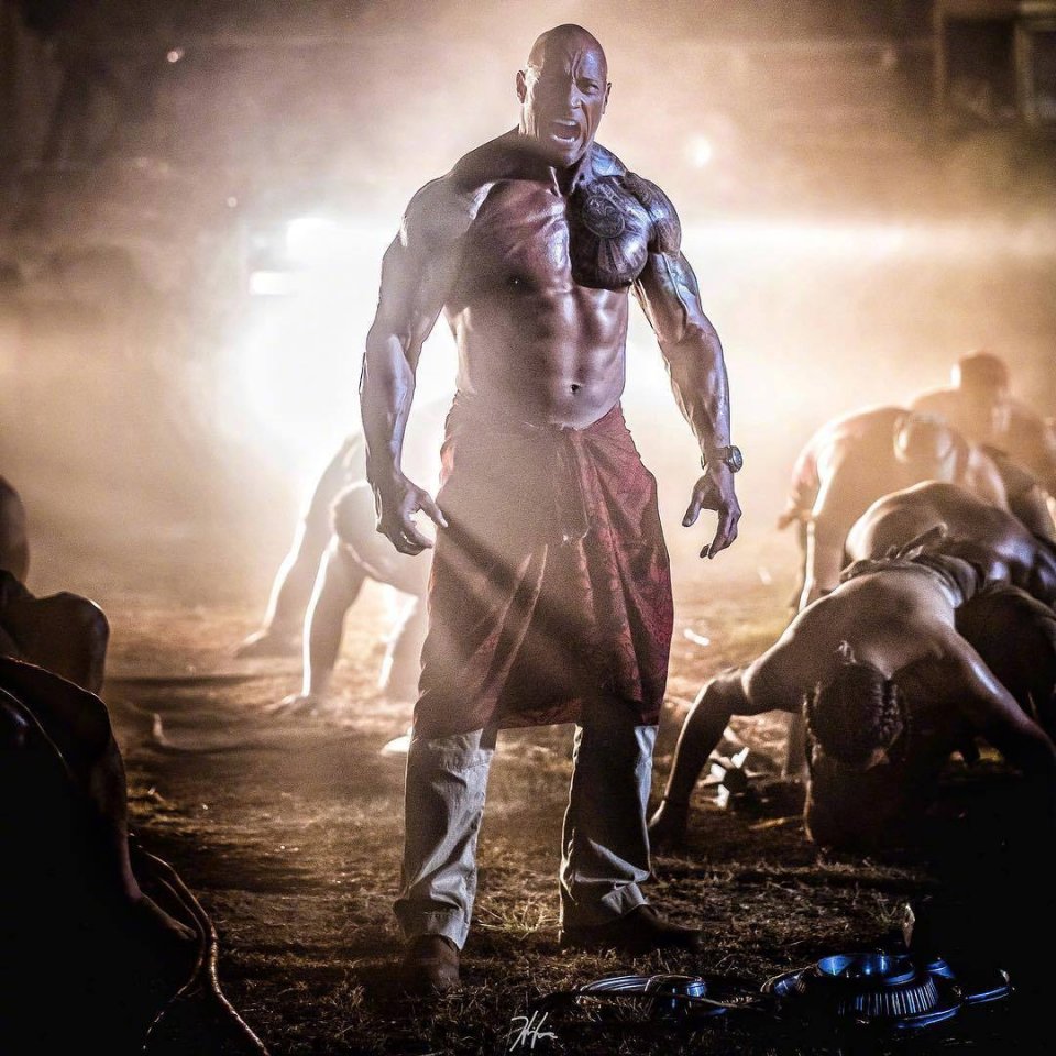 剧照中,强森的穿着打扮十分抢眼,上面光着膀子秀肌肉,下面却裹得严严实实,除了一件裤子之外,还绑着一条红裙。此外,强森周围的地上还爬满了壮汉,似乎是在臣服,不知道电影中到底发生了什么事情。