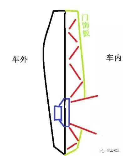 这是不加木垫圈,喇叭工作时声波的传导示意图,一部分声波散射在门饰板内部,引起共振导致声音发闷。