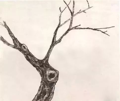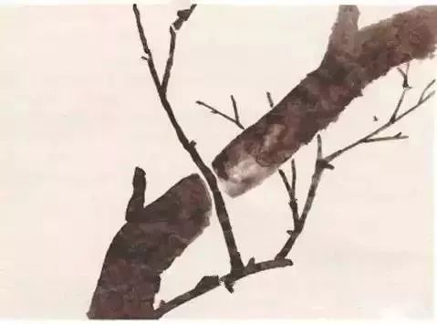 勾皴法画枝干:借鉴山水画中树木的画法,用短锋的狼毫笔,挤掉一定的水分后散开锋。先从树的主干开始画起,中锋勾写,用渴墨勾出飞白的线条,勾勒时要做到胸有成竹,行笔要稳而有顿挫、提按,把握运笔的快慢节奏,随勾随皴,根据不同树木的皱裂纹用不山的皴法。切忌线条平滑、僵直。