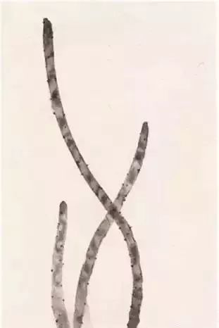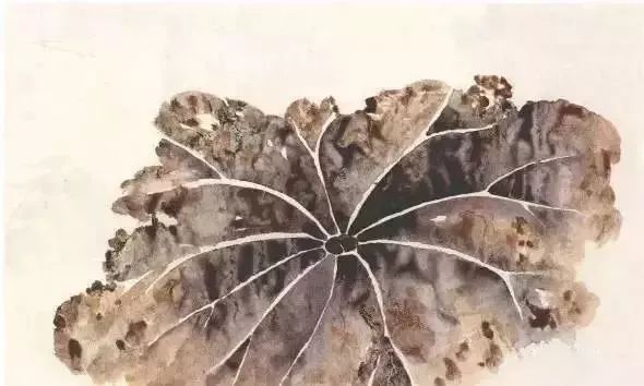 留筋法:对于像荷叶、芭蕉、蒲葵等植物的大片叶,可以采用留筋的画法来表现。亦即靠水线与水线之间的留白形成叶筋,最后再提线勾出叶筋来,也可以不勾提。画时要注意叶筋留白的来龙去脉,要合乎叶片的物态走向,并注意收尾处的虚实处理。