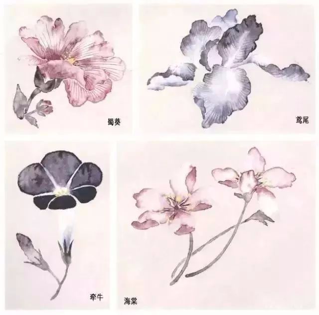 以蜀葵为例,蜀葵花冠为五瓣,花瓣纹路清晰,画时,事先把颜料调好,用中锋先蘸白色,再以笔尖取一点胭脂,一笔笔铺开,尽量做到一笔颜色一个花瓣,第二笔颜色衔接时要接着第一笔颜色走,逐渐过渡。趁未干时根据花瓣的形态结构,从外而内,用水笔将色冲开,任其自然渗化,在花瓣的基部点画深红和深紫色,并使色笔之间自然衔接,不要有明显的笔痕。干后用胭脂调墨勾出纹路。