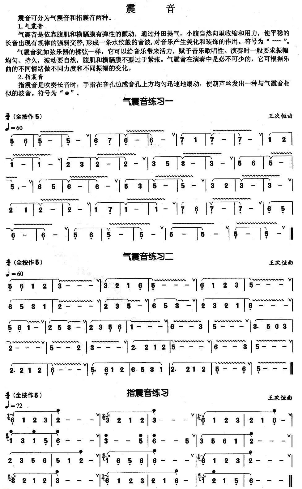 指震音也叫虚指颤音,还叫隔孔打音,一般用符号~~~标识,指震音是葫芦丝、巴乌演奏中重要的技巧,在傣族风格的乐曲中用的最多。其方法很简单,顾名思义,隔孔打音,即在本音位置的下二孔,手指平稳扇动,产生类似弦乐揉弦的效果。以全按作5.为例,当吹奏3时用无名指扇动1音孔,吹奏2时扇动7.音孔其他的依次类推。