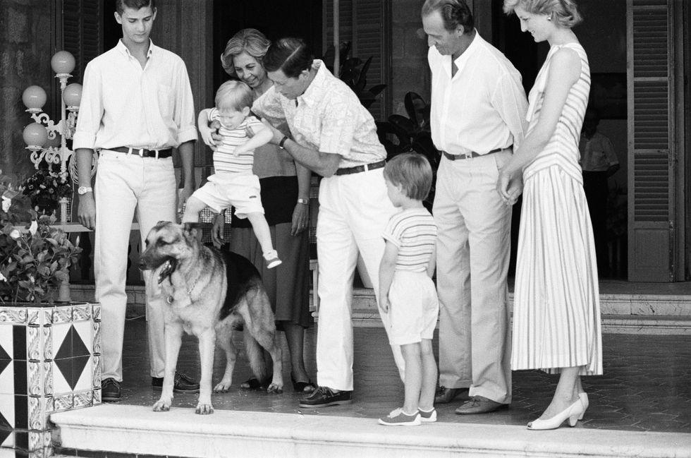 1986年时,戴安娜王妃一家偕同当时的西班牙国王胡安卡洛斯一家度假,查尔斯王储作势让小哈里王子骑上宠物猎犬。