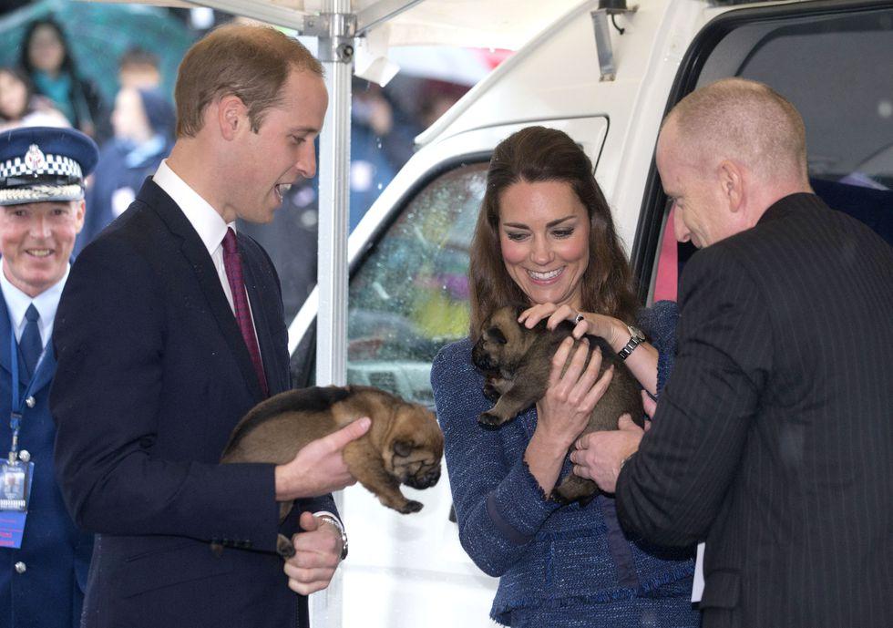 2014年威廉王子与凯特参访纽西兰王家警察学院时,开心抱着两只幼犬。