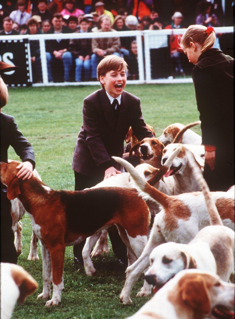 威廉王子在1991年巴德明顿马术竞赛上,被一大群马场猎犬包围,显得十分兴奋。