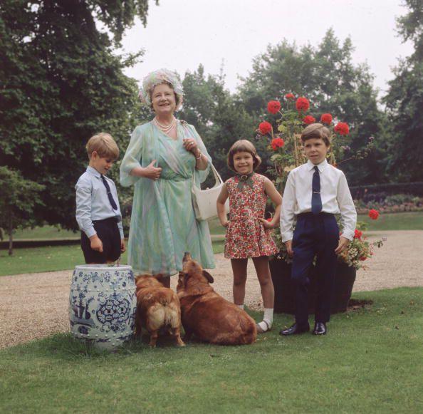 1970年:女王的母亲——伊丽莎白王太后,与孙子、小狗们庆祝70大寿。