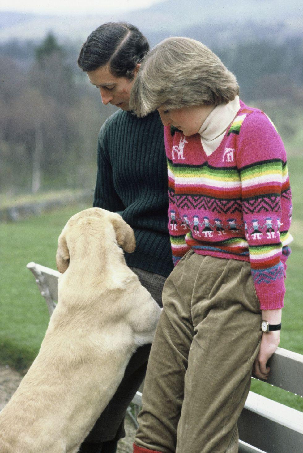 1981年还是查尔斯王储未婚妻的戴安娜,在巴尔曼德庄园(Balmoral Estate)与查尔斯及宠物狗度假。
