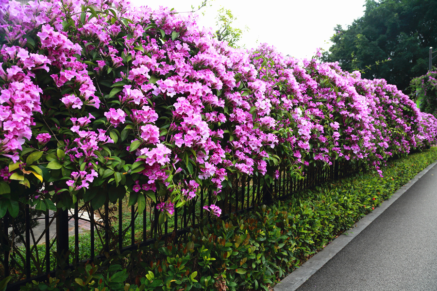 藤本类植物,不会直立生长,需要依靠攀爬,爬到哪花开到哪,很容易养成花墙、花柱、花篱等,是极好的园艺造景材料,代表的有藤本月季、铁线莲、飘香藤等。今天介绍的这种花,名为紫铃藤,比较小众却又很值得拥有的藤本。