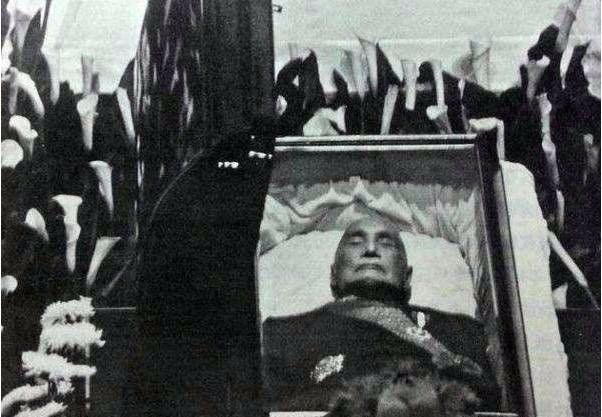遗体贴身包着丝绵、黑裤、黑皮鞋。