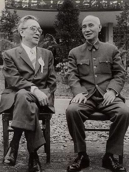 晚年蒋介石与台北中央研究院院长胡适交谈。