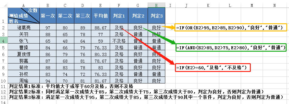 一、if、ifs函数。if函数的参数=if(判断条件、满足条件返回的值,不满足条件返回的值)。如下图所示,表格下方是判定标准解释,表格右方是公式。判定1的标准是三次测验平均成绩大于或等于60分及格,否则不及格。判定2表示三次测验成绩同时满足大于85,75,80才可判定为良好,否则为普通,公式中的嵌套了and函数表示同时满足条件。判定3表示三次测验成绩大于95,85,90满足其一即可判定为良好,否则判定为普通。if函数中的or函数表示满足其中一个条件即可。