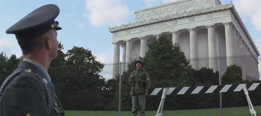 这段影片拍摄的地点是美国绝对的政治中心,人们聚集的建筑是著名的林肯纪念堂,这个建筑由美国著名的建筑师亨利·培根设计完成,立面的造型借鉴了古希腊雅典神庙,四周有36根多立克式柱子围绕,象征林肯时期美国的36个州。