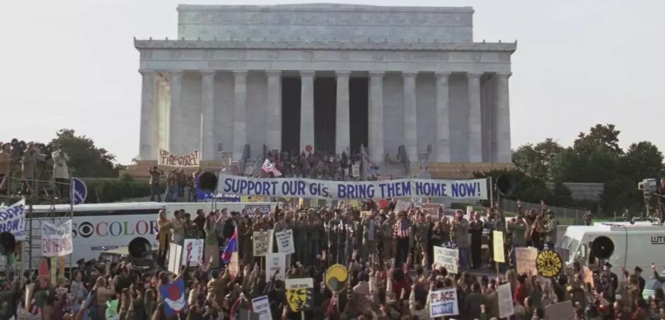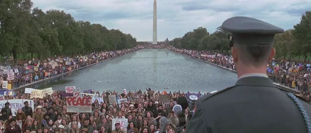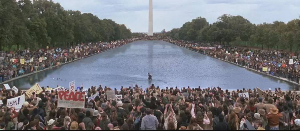 这场运动参与人数最多的时候有超过百万人罢工,全国学生罢课,仅华盛顿就有超过50人上街游行,甚至还发生过暴力冲突,可见影响之大,而阿甘的这次活动正是当时的一场活动的情景再现,需要提醒大家的是,影片中的这个镜头其实没那么多的群众演员,大部分都是电脑复制粘贴的结果。