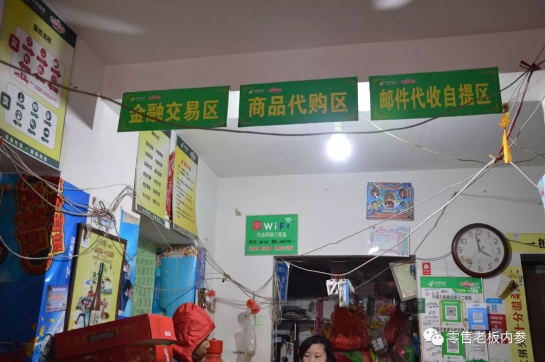 店内,“金融交易区”、“商品代购区”、“邮件代收自提区”三大柜面服务牌,和“WIFI无线网络已覆盖”以及支付宝收钱码和红包码等,形成这个村里小店的数字时代标签。