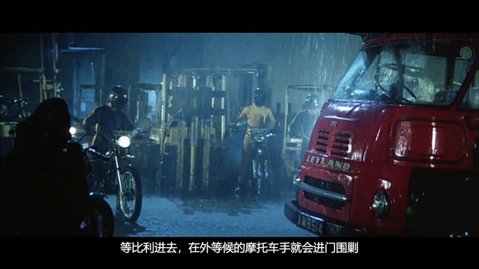 接着是一段摩托车的车技秀,比利技压群猪成功逃脱,他又在雨中制服一个集团高层,并成功逼问出集团的窝点所在。