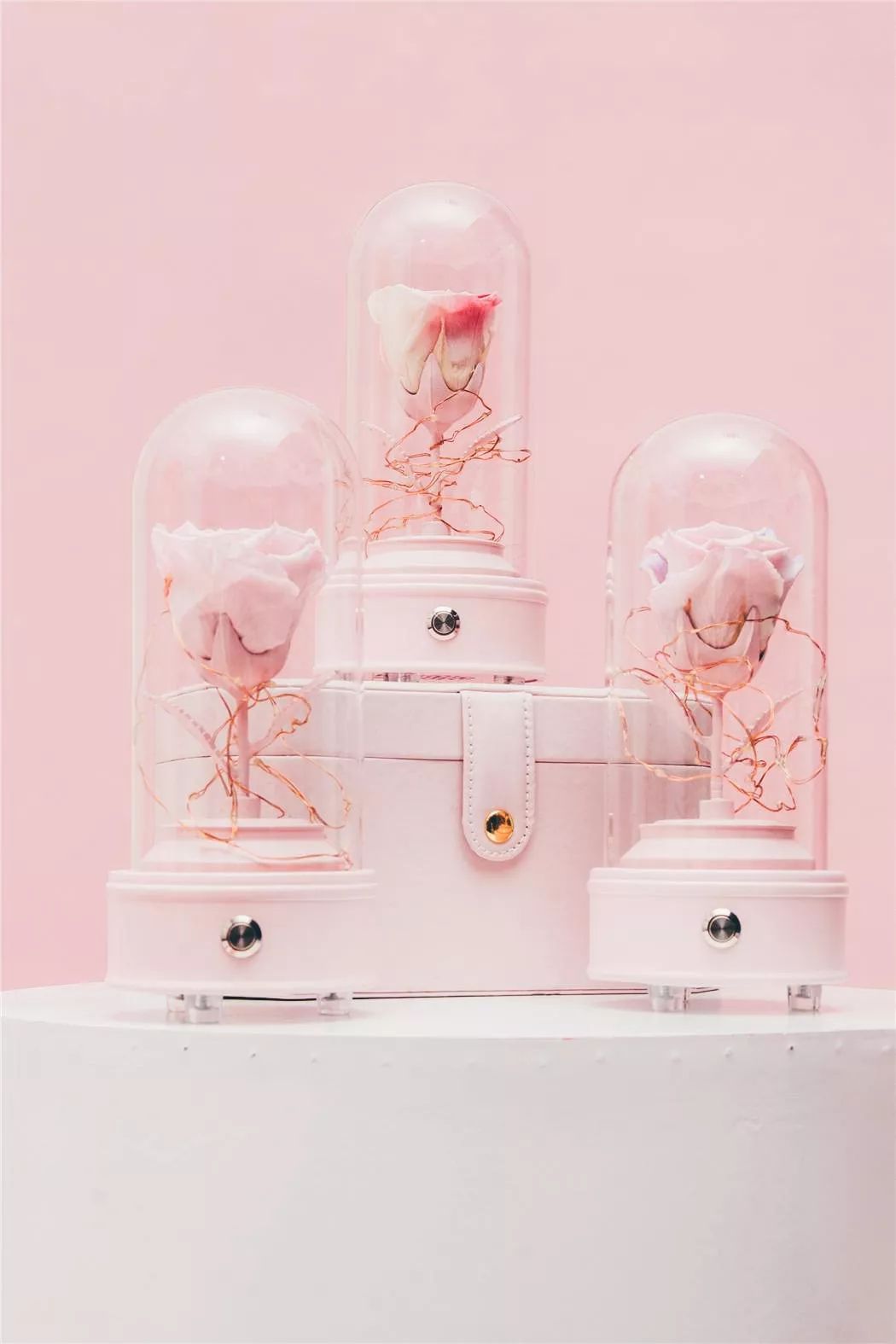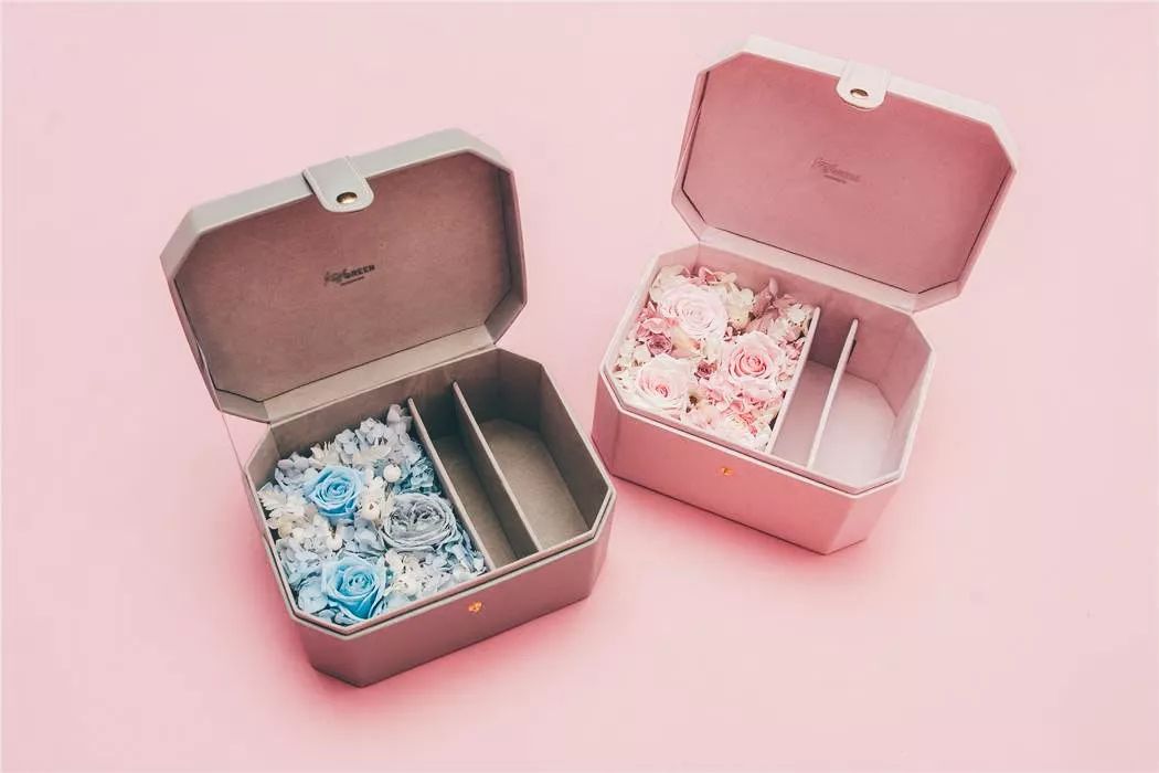 有“怦然心动”与“蓝色星辰”两款可选,整体色系设计分别为粉白系与蓝白系,营造出甜腻可人的氛围,好让往日里的小甜蜜小任性小悸动有了落脚地。礼盒选用手感及细节十足的 PU 材质小皮盒,内部绒布衬里,并且配以两块可移动拆卸隔板,可随意划分置物空间,放入您精心挑选的礼物,与永生花设计搭配,相得益彰。