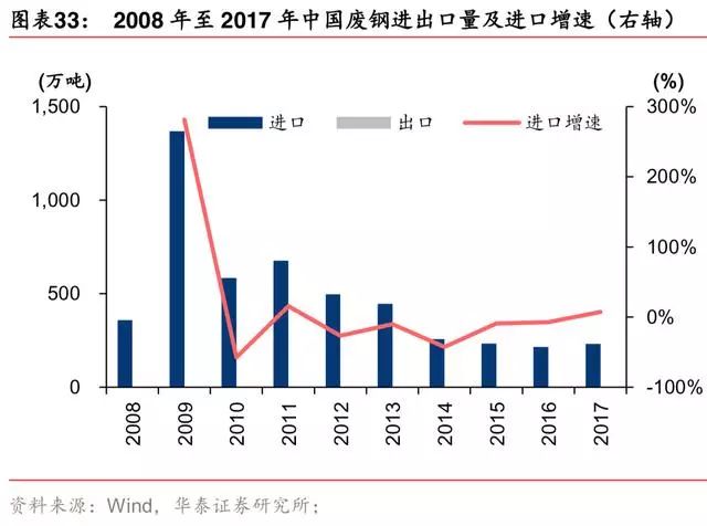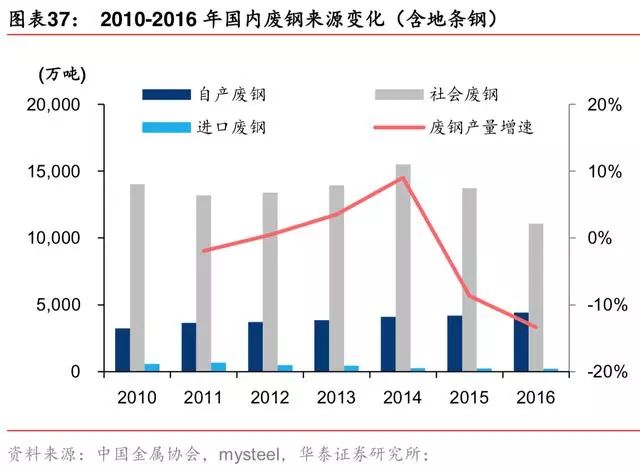 据中国废钢协会,2017 年自产废钢、社会废钢分别为 4216、11030 万吨,合计 15246 万 吨;但据富宝资讯,2017 年 12 月废钢协会秘书长李树斌称协会预计 2018 年废钢产量 2.2 亿吨,同比增加 2000 多万吨,增幅 10%,据此测算则 2017 年废钢产量约 2 亿吨,与前 面提及的 1.5 亿吨相去甚远。