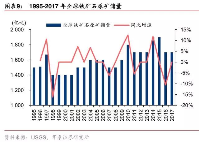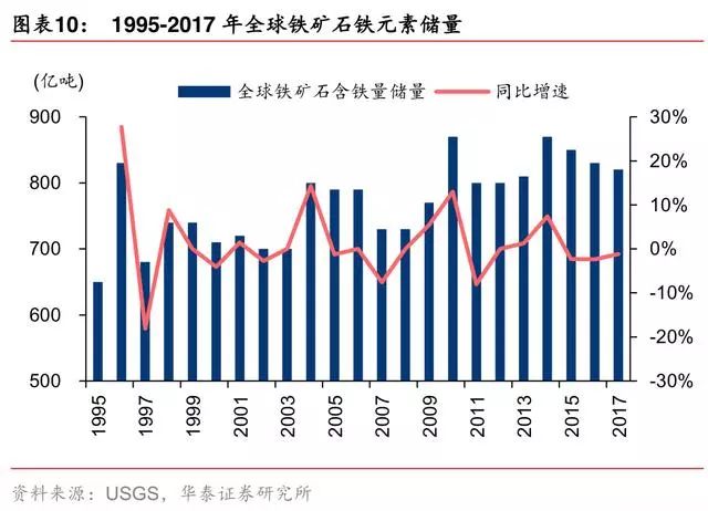 全球铁元素储量于 2014 年见顶。据 USGS,全球铁元素储量已从 2014 年高峰期的 870 亿吨下降至 2017 年的 820 亿吨,或与矿山减少勘探等相关资本开支有关。